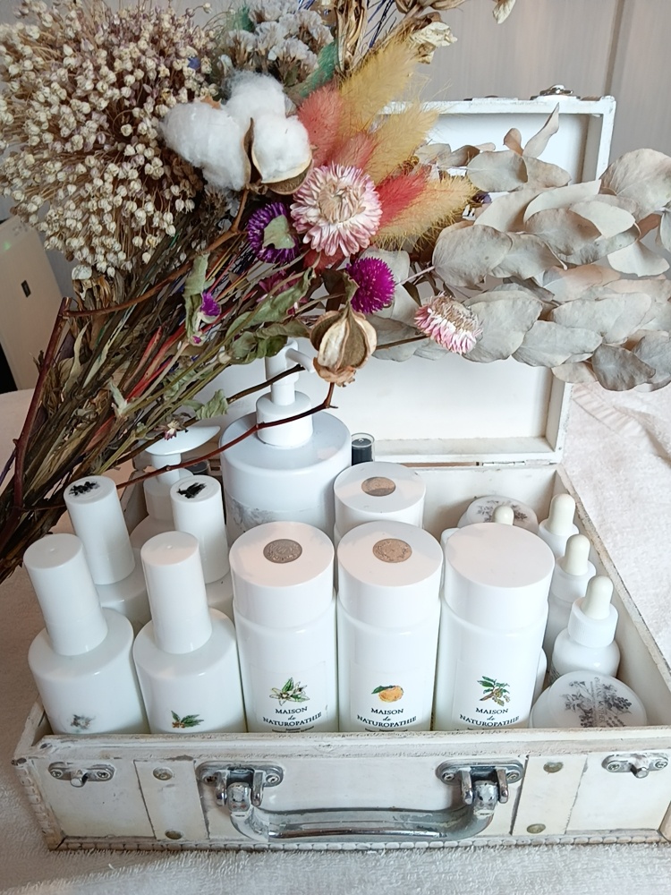 1️⃣施術前にカウンセリングを行い、お客様の体調、お肌、お身体のお悩みから、使用するボタニカル4種マッサージオイル、植物蒸留水、植物エキス、植物オイルを一緒に選び施術に使用致します🌸